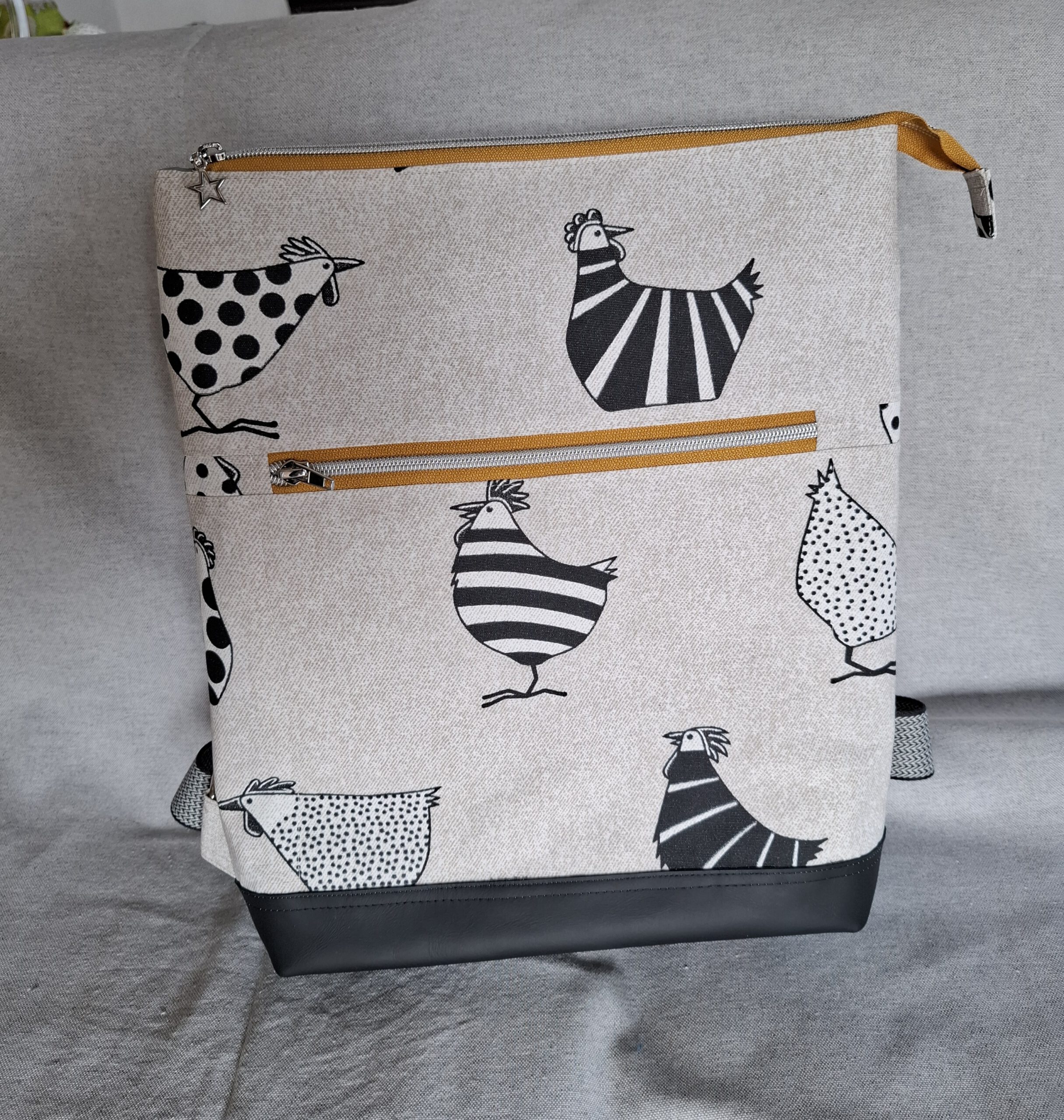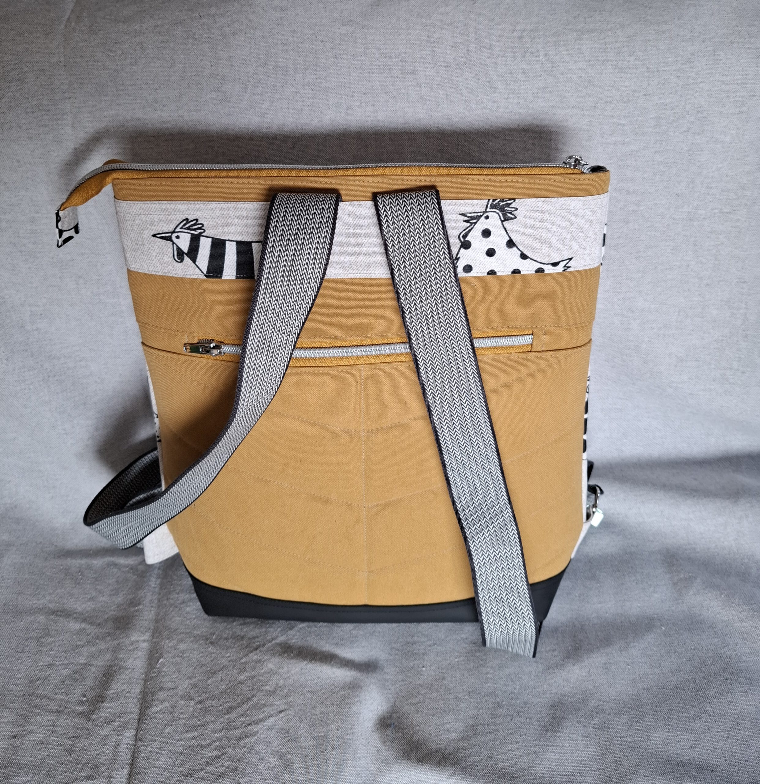 Ein Rucksack mit Charakter – verspielt, modern und absolut alltagstauglich. Der beschichtete Frontstoff mit den charmanten Hühner-Motiven bringt sofort gute Laune, während der Rücken aus gewaschenem Canvas in warmem Gelb für einen natürlichen, lässigen Look sorgt.