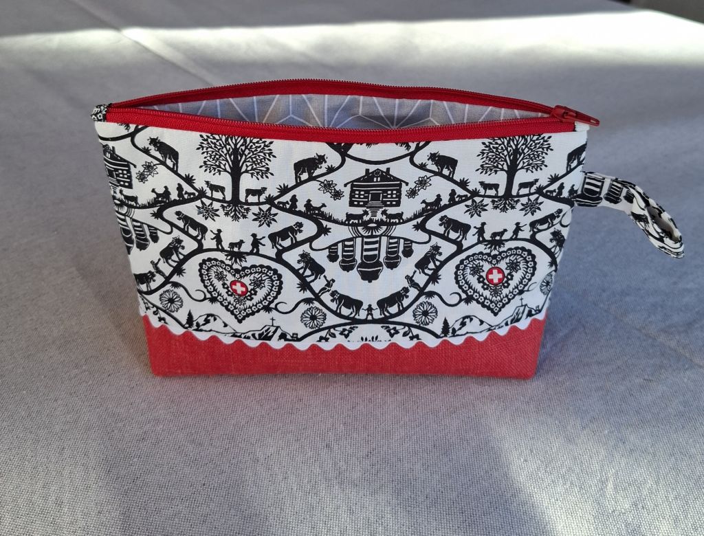 Diese liebevoll gestaltete Kosmetiktasche verbindet traditionelle Motive mit modernem Design. Der dekorative Stoff mit filigranen Alpenszenen, Tieren und Herzdetails bringt ein Stück Heimatgefühl mit sich und wird durch das kräftige Rot des beschichteten Leinens stilvoll ergänzt.