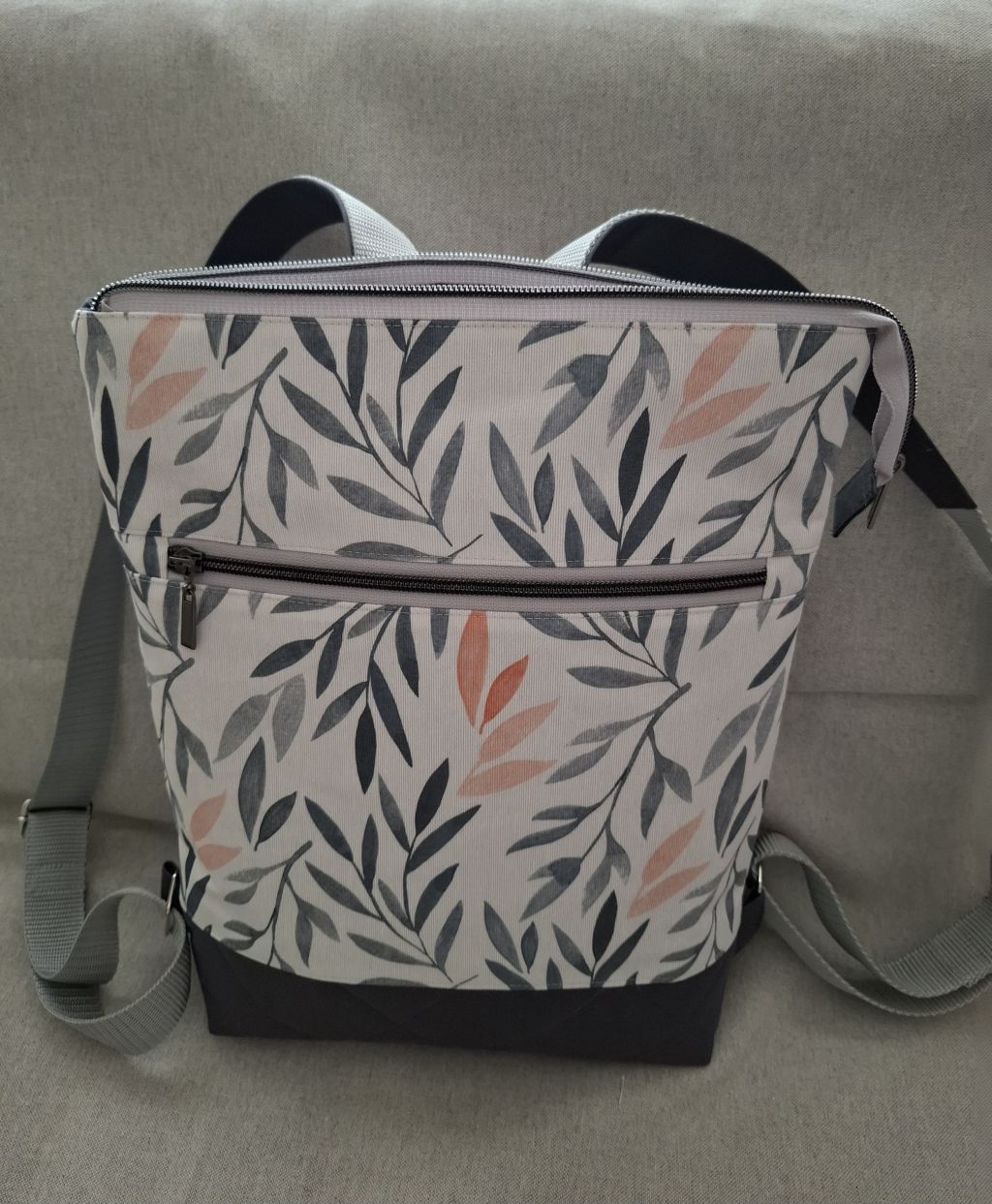 Moderner Rucksack aus beschichtetem Dekostoff mit zartem Blattmuster in Grau- und Apricottönen, kombiniert mit robustem, grauem Oilskin. Praktische Reissverschlussfächer vorne und hinten bieten schnellen Zugriff auf wichtige Dinge. Innen ist der Rucksack mit einem beschichteten, grauen Baumwollfutter ausgestattet und verfügt über ein Einsteckfach sowie ein weiteres Fach mit Reissverschluss. Die verstellbaren Gurten sorgen für angenehmen und leichten Tragekomfort, während die schmale Form einen eleganten Look bewahrt.