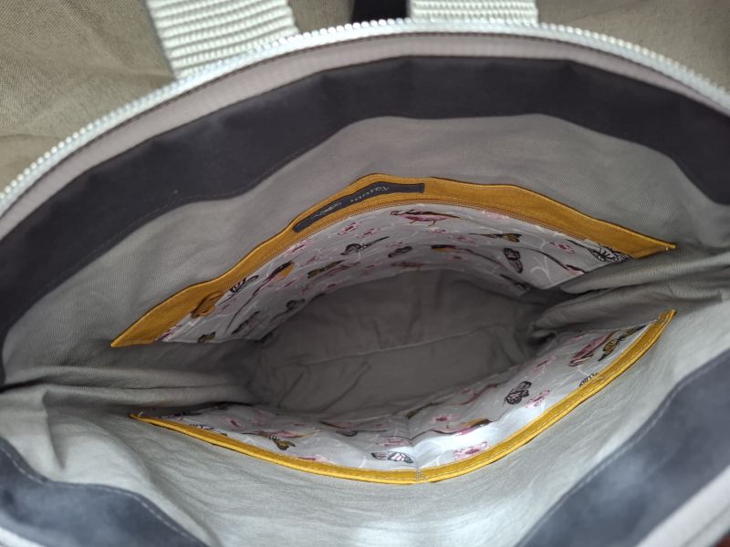 - Innen: beschichtetes Baumwollfutter mit einem grossen Reissverschluss und einem Einsteckfach für Handy oder Brille